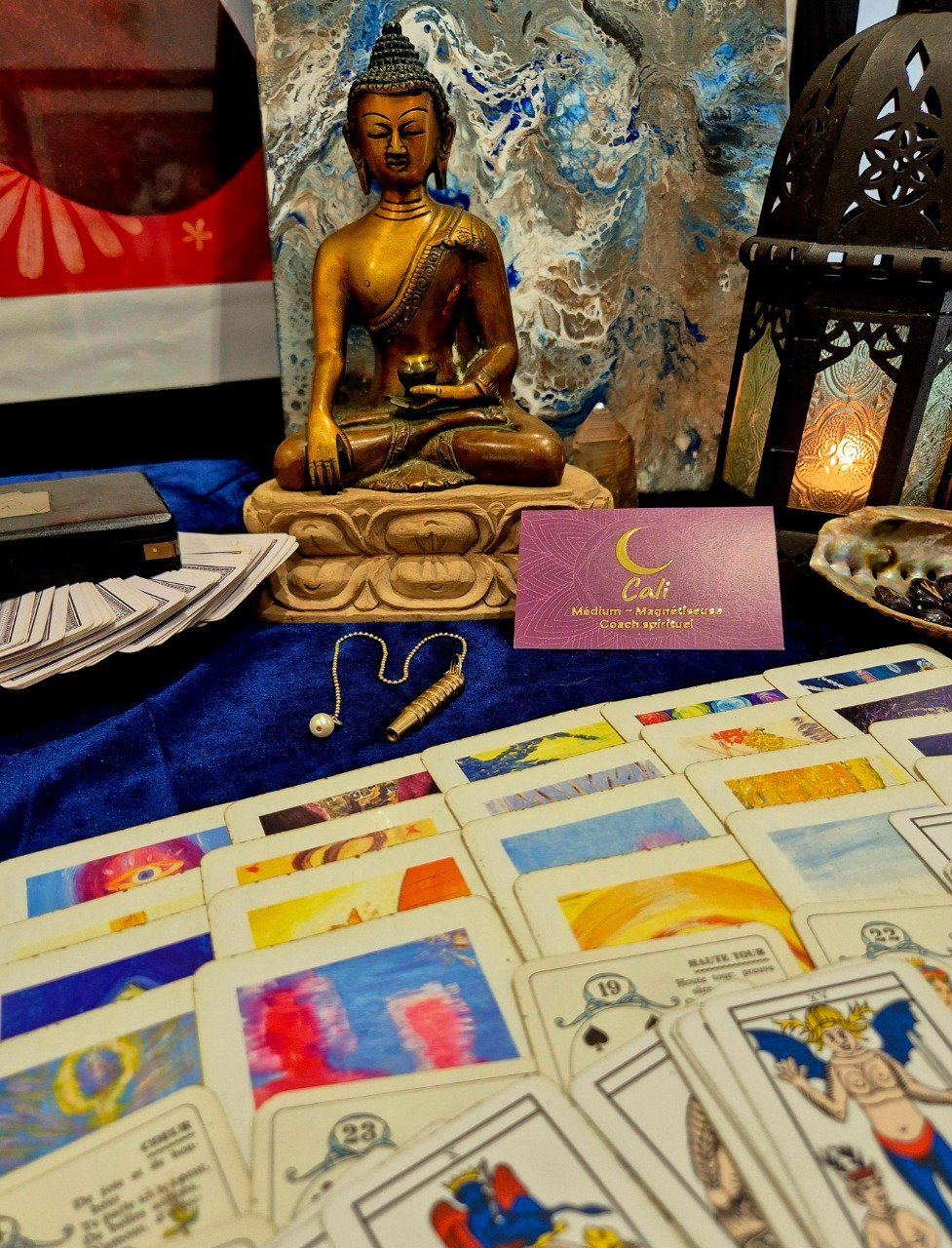 Utilisation tarots, runes, pendule et oracles pour structurer la canalisation.